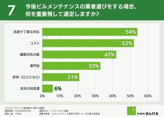 最後に、今後ビルメンテナンスの業者選びをする場合、何を重要視して選定するのか伺ったところ、「迅速で丁寧な対応(54.0%)」「コスト(52.0%)」「顧客対応の質(42.0%)」という回答が集まりました。