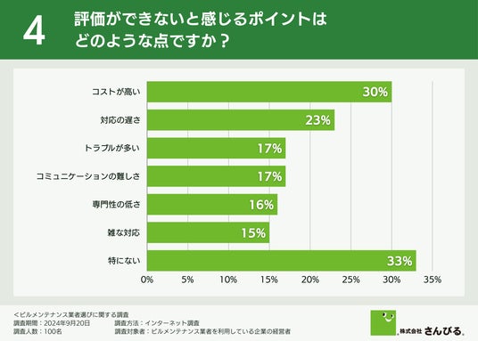 一方で評価できない点について伺ったところ、「コストが高い(30.0%)」「対応の遅さ(23.0%)」という回答が多く集まりました。