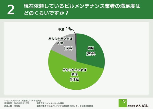 次に、現在依頼しているビルメンテナンス業者の満足度について伺ったところ、「どちらかといえば満足(53.0%)」「満足(29.0%)」という回答が集まり、全体の82.0%が業者に満足している結果となりました。
