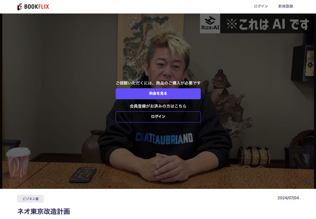 ホリエモンAI学校株式会社(本社:東京都新宿区、代表取締役CEO:荒木賢二郎)は、本日2024年7月5日より著者のAIが朗読し、見た目も著者そっくりに再現されたムービーブックが購入できる新サービスホリエモンAI書店「Bookflix(ブックフリックス)」を公開しました。新しい読書体験「本を観る」を提供することで、教育とエンターテイメントの融合を実現します。