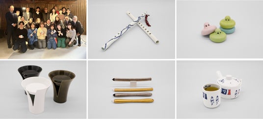 作品は写真中央上から時計回りに「嬉野浮立用磁器製横笛」「ちゃつぼおし」「emaki」「PorPen」「茶香炉」