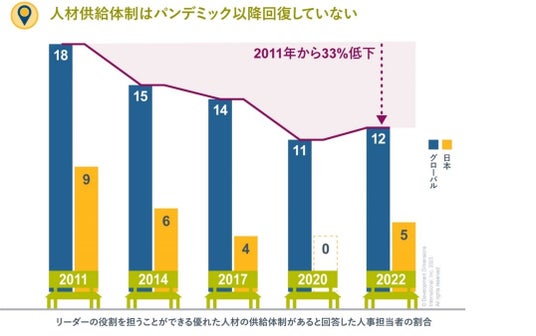 人的資本の情報開示が求められる中、経営幹部のサクセッション・プランの重要性はより高まっています。一方で、弊社独自の調査*によると、「リーダーの役割を担うことができる優れた人材の供給体制がある」と回答した人事担当者の割合は、2020年の新型コロナウイルスによるパンデミック以降、国内・グローバルともに低下し回復していません。