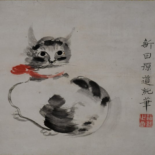 新田猫新田岩松氏の歴代当主が4代にわたって描いた猫絵は、ネズミ除けの効果があるとされ蚕室などに貼られ、養蚕の神様として信仰されていました。「蚕を食い荒らすネズミの害は新田義貞一族の怨霊によるもの」との俗信があったため、それに対抗できるものとして、特に人気を集めました。また、「交代寄合」格の旗本として江戸城へ登城するための費用を捻出するため、4代にわたり猫絵を描き養蚕農家に販売していましたが、明治時代になると美術品としてヨーロッパで評価され、男爵となった殿様(新田俊純)はバロンキャットと呼ばれました。