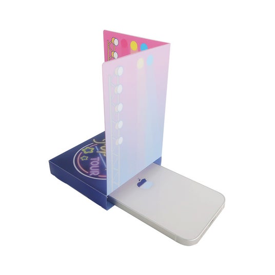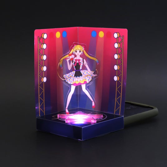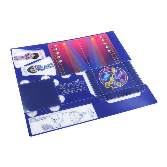 納品時はシート状なので配布や在庫時にかさばらず、受け取る側も持ち帰りやすいのも特徴です。ステージの下部にスマホが差し込めるスペースがあり、スマホのライトでライトアップできるので、雰囲気作りもカンタン。シートにクリアスタンドがついているので、アイドルのデザインを入れれば、手持ちのアクスタがなくても推し活を楽しむことができます。