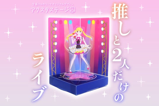 アクスタ(アクリルスタンド)を家で可愛く飾れる「アクスタステージ」を新商品として発表。背面からスマホを入れてライトアップすることができる写真映えアイテム。全面フルカラー印刷でオリジナルデザインが可能。