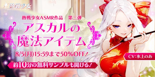 Neorigin Games Publishingは、2024年7月8日(月)より、現在配信中の終末世界放置系RPG『熱戦少女』に登場する「アスカル(CV:氷上のあ)」によるASMR作品「サナティオニスの癒しのひととき」シリーズ第三弾『アスカルの魔法アイテムーアスカル編』をDLSiteにて発売開始いたしました。