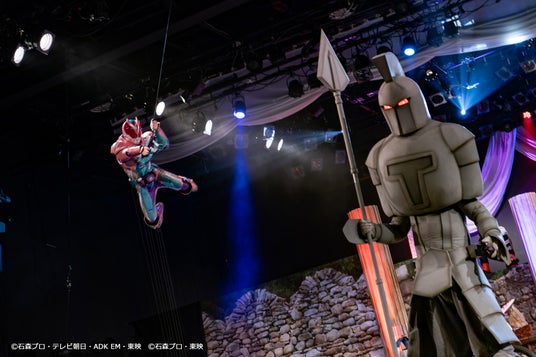客席上空を仮面ライダーが駆けるワイヤーアクションも見せどころの1つ。大人のファンも唸らせる圧巻のショーをお届けします。