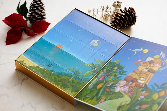 今年から初登場のアドヴェントカレンダーは西アフリカのサントメ島が舞台。カフェタナカは2019年に「カフェタナカ希望の有機カカオ農園」を開園し、サントメカカオの原種を守りながら荒れた農園の再生と現地女性を支援するサントメプロジェクトを遂行しており、2024アドヴェントではその物語の序章を表現しています。