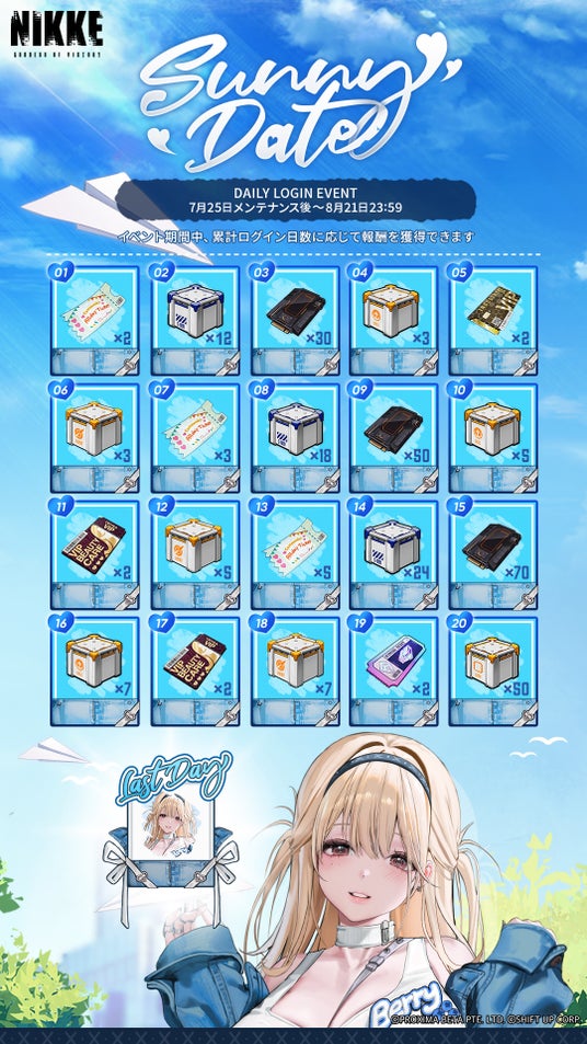 イベント期間中、ゲームにログインするとデイリー報酬を最大21日分獲得できます。21日間ログインすると、限定コスチューム「ティア:ラブリーデート」を獲得できます。