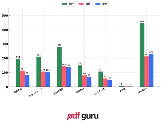 西洋で制作される日本マンガの実写化について、回答者の約半数(44.5%)は「特に気になる点はない」と答えました。何らかの懸念を持つ層に限ると、最も多いのは「文化の誤解や誤表現」(27.9%)で、次いで「キャスティングの問題」(21.1%)、「原作への敬意不足」(19.4%)が続きます。「作品のクオリティの低さ」(15.0%)や「構成・テンポの不一致」(10.7%)は比較的少数派でした。全体として、懸念を抱く人々は、映像技術よりも文化的な正確さに重点を置く傾向が見られます。