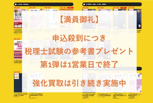 2024/11/29(金)よりスタートした税理士試験の参考書プレゼントは、申込殺到により1営業日後の12/2(月)に終了いたしました。第2弾の開催を目指し、参考書の買取は引き続き実施中です。