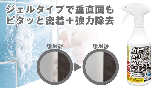 ジェルスプレータイプは特殊なレオロジー制御技術により、通常なら薬剤が垂れて流れ落ちてしまう浴室の壁面やドア周りにおいて、ゴムパッキンやタイル目地材(モルタルや樹脂)といったカビの根が深く入り込みやすい素材にも留まり、カビを強力に除去します。