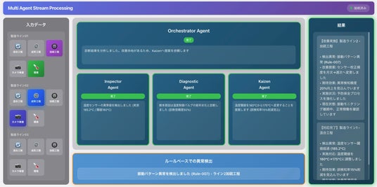 技術的な特徴として、Vantiqのリアルタイム処理により、データを「保存してから処理」するのではなく、受信した瞬間に判断を行います。イベントドリブンのアーキテクチャにより、状況変化をトリガーとして複数のAIエージェントが自律的に起動・連携します。