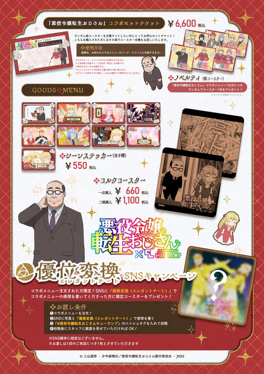 アニメ制作会社パッショーネ、ハヤブサフィルムが運営している『Anime Cafe&Bar CUE LAMP』は3月21日(金)より『悪役令嬢転生おじさん』コラボメニュー&グッズの販売をいたします。