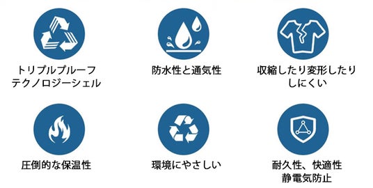 トリプルプルーフテクノロジーシェルポリエステル100%の生地を採用