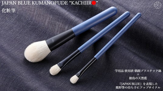廃棄予定だった学用品 使用済朝顔プラスチック鉢を回収・リサイクルし、徳島の天然藍にてJAPAN BLUEを表現した、アップサイクル熊野筆「JAPAN BLUE 熊野筆 "KACHIIRO"」を展示いたします。