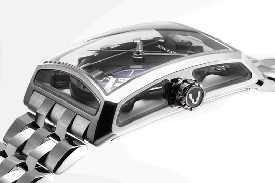 「MINASE」の原点は、ブランドのシンボルに掲げるドリル。金属のもつ精密さと美しさを極限まで引き出す切削・研磨技術をもつ高性能工具メーカーのKYOWAが情熱を惜しむことなく注いで完成させた芸術作品が時計ブランド「MINASE」です。MIINASEの美しさは、大胆にして緻密。これまで世界中の時計ブランドが想像すらできなかった 超立体的なデザインを考案し、なおかつ、研磨マシンのバフが届かない細かな断面までも磨きあげるための構造を創りだしました。「MINASE」の時計は、ハンドメイドの集合体。技術がなければ、出発点にすら立てない。技術があっても、情熱と時間を費やさなければ完成しない。大量生産が不可能なものが放つ存在感、先進性と芸術性を 兼ね備えた究極のインダストリアルデザインを待ち望むオーナーが世界にいることを信じて時計を創り続けます。