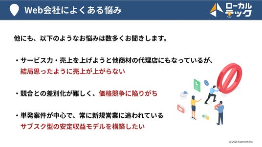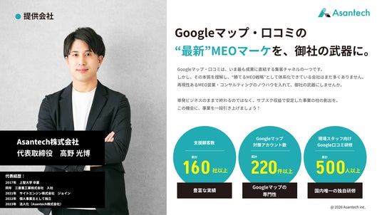 Asantech株式会社は、Web制作会社・広告代理店等のWeb集客支援業者向けに、高収益かつ継続性のあるMEO事業を構築する全く新しい「ローカルテック代理店」を20社限定で募集開始いたしました。