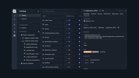 Notebookとは別に、再利用可能なSQLクエリを効率的に管理・共有できるQuery機能に加えて、SQLクエリやテーブル、スキーマオブジェクトに対して、メタデータの付与(アノテーション)やタグの追加ができるCatalog機能の提供を開始しました。Catalog機能では、利用状況に基づいてPopularity(人気度)が自動計算されるため、社内でよく使用されるSQLクエリやテーブルを簡単に把握できます。
