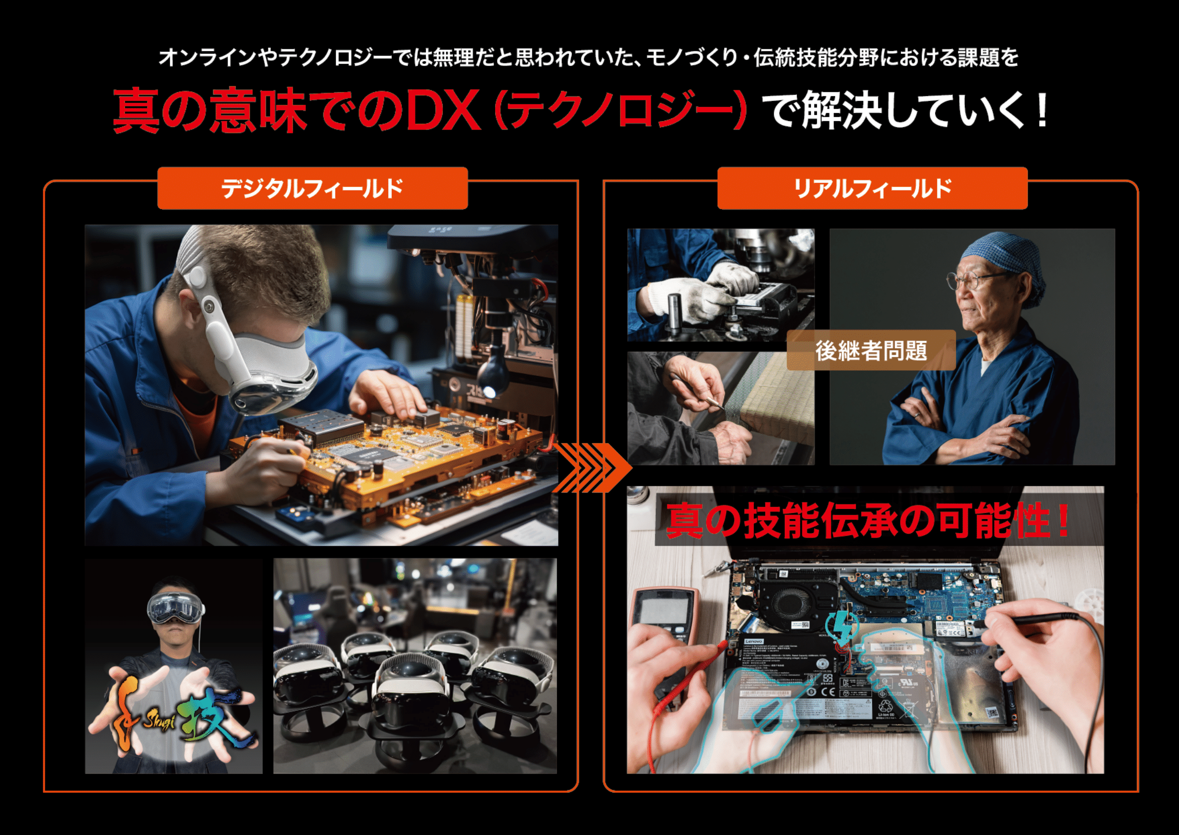 SHUGIは、熟練技能者の手の動きをAIとXRで解析・可視化し、学習者の動作と重ね合わせて技能を伝承するインクルーシブなトレーニングシステムです。遠隔地や身体的制約のある方でも技能習得が可能で、製造・医療・福祉・教育・その他の多くの業種での新人教育など多様な分野での応用が期待されています。