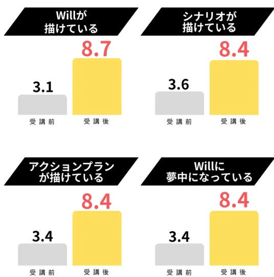 - 抽象的だった将来像が『これがやりたい』と具体化した。絵空事だった夢に現実味が出て、頑張ろうという気持ちが生まれた。