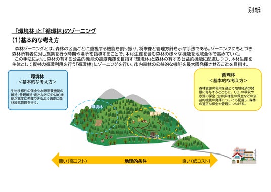- この背景には、静岡市の総面積の約76%を占める森林の適正な管理が求められていることがあり、今回、市内の森林を公益的機能の高度発揮をめざす「環境林」と、木材生産を主体的に行う「循環林」に区分し、それぞれの特徴に応じた森林経営管理を推進することとなりました。
