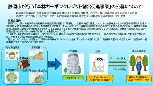 静銀経営コンサルティング(社長 鈴木 淳史)では、「地域共創・共生・循環モデル」の構築に向けた取組の一環として、静岡市が公募した「森林カーボンクレジット創出促進事業」の運営事務局業務を受託しました。このほど、新たなカーボンクレジット創出に取り組む事業者の募集を開始いたしますので、その概要をお知らせいたします。