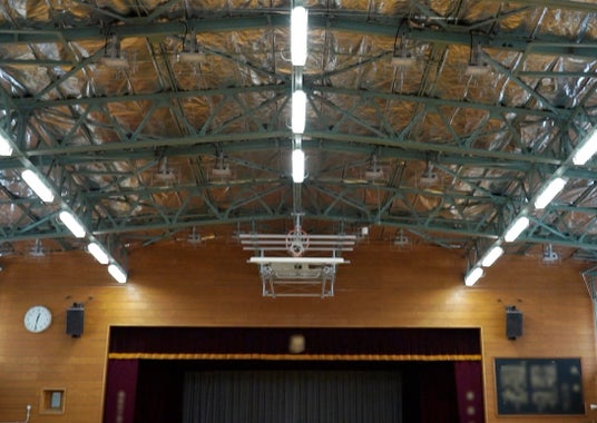 東京都世田谷区立中学校の体育館の天井に設置済みの屋内用遮熱シート「はるクール」