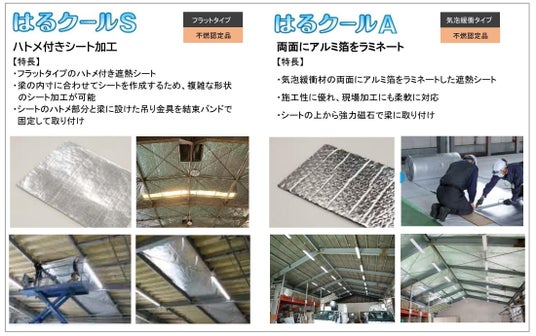 「はるクール」には、天井の梁に設けた吊り金具を結束バンドで固定するフラットタイプのハトメ付きシート加工の「はるクールS」と、天井の梁に強力磁石で取り付ける気泡緩衝材の両面にアルミ箔をラミネートした「はるクールA」の2タイプを取り揃えています。なお、両タイプともに不燃認定品で、現場の状況に対応した施工ができるようにしています。