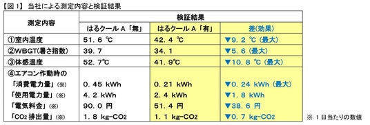 栃木県小山市にある当社の試験・検証施設「ライフイン環境防災研究所」において、2棟の試験棟を設置し、「はるクールA」の設置有無による室内の温度上昇の抑制効果と、エアコン作動時の消費電力量を確認する測定を実施しています。その結果、室内温度は「はるクールA(有)」が「はるクールA(無)」に比べて最大でマイナス9.2℃、体感温度も同様にマイナス10.8℃となりました。また、1日当たりのエアコン作動時の使用電力量は同様にマイナス1.8kWh、電気料金が同様にマイナス38.6円、CO2排出量が同様にマイナス0.7kg-CO2という検証結果を確認しています(【図1】参照)。