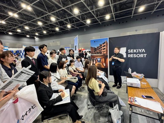 7月12日、福岡で開催されたマイナビ合同企業説明会にて、SEKIYA RESORT代表取締役 林が登壇し、自ら会社概要を紹介しました。当日は、128名の学生がブースを訪れ、関心を寄せる様子が見られました。