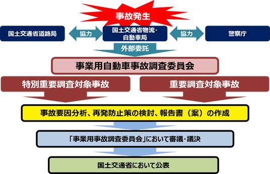 - 国土交通省は平成26年(2014年)6月、 (公財)交通事故総合分析センターを事務局として、各分野の専門家から構成される「事業用自動車事故調査委員会」を設置し、事業用自動車の重大事故について事故要因の調査分析を行っている。