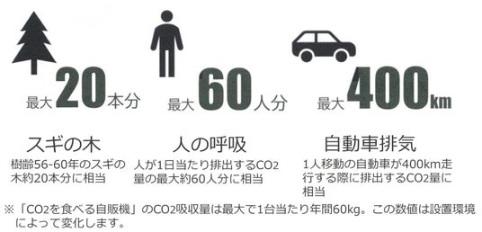 ◆CO2を食べる自動販売機のSDGs 貢献スギ20本分/年間に相当するCO2吸収し、SDGsの目標12「つくる責任、つかう責任」においてはつかう責任として消費電力削減、CO2吸収・貯留、吸収材を活用した廃棄物削減(タイル)に貢献をいたします。目標13「気候変動に具体的な対策を」に直接貢献をいたします。