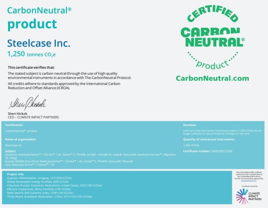 ◆カーボンニュートラル認証製品の SDGs貢献Steelcase Chair1.9本の苗木を10年間成長させるCO2排出量を気候変動の影響を緩和する質の高いプロジェクトにてオフセットし、SDGsの目標07「エネルギーをみんなにそしてクリーンに」においてクリーンエネルギーの利用拡大によりカーボンオフセット。目標13「気候変動に具体的な対策を」に直接貢献をいたします。