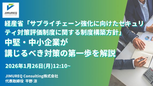 JIMUREQ Consulting株式会社(本社:東京都中央区、代表取締役:平野 涼)は、『CISA保有コンサルタントが解説する 経産省「サプライチェーン強化に向けたセキュリティ対策評価制度に関する制度構築方針」対応の考え方と第一歩』セミナーを開催いたします。