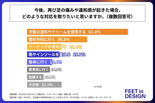 今後、再び足の痛みや違和感が起きた場合、取りたい対応のトップ3は、1位「市販の湿布やクリームを使用する」、2位「整形外科に行く」、3位「テーピングを使用する」