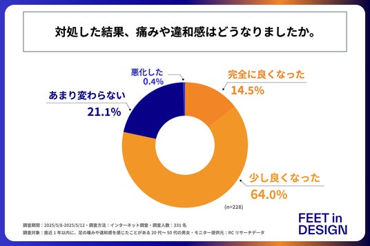 続いて、足に痛みや違和感が起きた際、何らか対処をしたと回答された方に「対処した結果、痛みや違和感はどうなったか」を尋ねる設問への回答では、1位が「少し良くなった」で64.0%、2位が「あまり変わらない」で21.1%、3位が「完全に良くなった」で14.5%という結果になりました。この結果から、対処した結果、痛みや違和感が完全によくなっている人は約15%程度に留まることがわかりました。