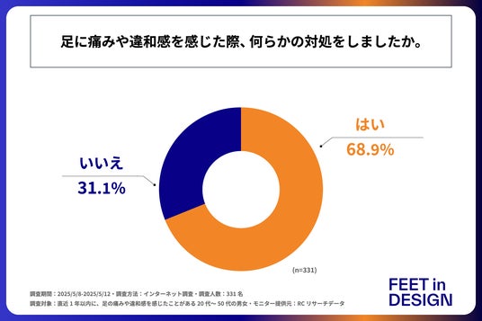 まず、「足に痛みや違和感が起きた際、何らか対処をしたか」を尋ねる設問への回答では、「はい」が68.9%、「いいえ」が31.1%という結果になりました。この結果から、約3割の人は足に痛みや違和感が起きた際、何にも対処をせず放置していることがわかりました。