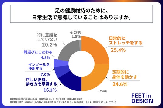 調査の最後、足に痛みや違和感が起きた際、何らか対処をしたと回答された方に「足の健康維持のために、日常生活で意識していること」を尋ねる設問の回答では、1位が「日常的にストレッチをする」で25.4%、2位が「定期的に身体を動かす」で24.6%、3位が「特に意識をしていない」で20.2%という結果になりました。この結果から、日常生活ではストレッチをしたり、定期的に身体を動かすことを意識している人が多いことが明らかになりました。