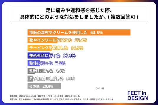 株式会社フィートインデザイン(本社:東京都中央区、代表取締役:久保田 敦)が提供する「ORTHOTICS(オーソティクス)」は、直近1年以内に、足に痛みや違和感が起きたことのある20代~50代の男女を対象に「足に痛みや違和感が起きた場合の対処法」に関する実態調査を実施しました。この調査結果から、足に痛みや違和感が起きた際、多くの方がどのように対処しているのかの実態等が明らかになりました。