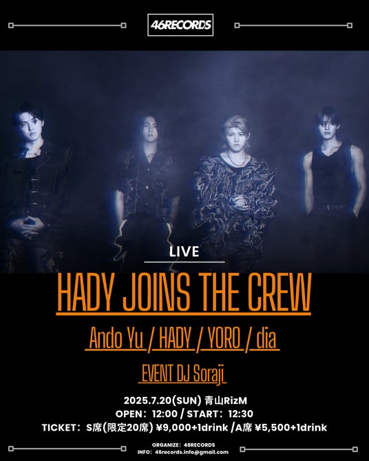さらに、この歴史的な加入を記念し、HADYのソロアーティストとしての覚悟を示す1st Digital Albumを本日サプライズリリース。そして、彼の新たな門出を祝うスペシャルイベント『HADY JOINS THE CREW』の開催が決定したことを、併せて発表いたします。