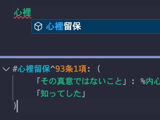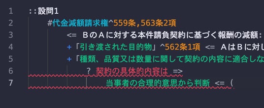 答案構成モードで、Matchaの構文として解釈できない箇所をその場で検出し、波線で表示するようになりました。エディタの支援を受けながら、思考を止めることなく法的推論をコードに落とし込めます。