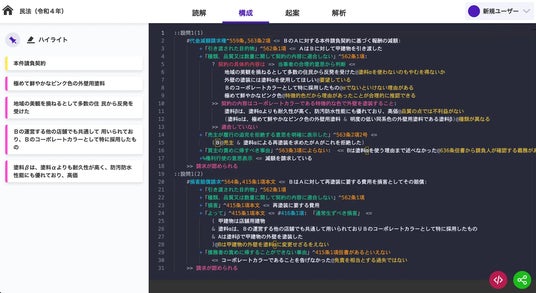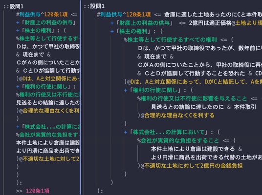 プログラミングのように法律答案が書けるエディタ「エルコード」は、「答案構成」と呼ばれる、答案を書く前の準備作業について、形式言語で記述できるエディターです。