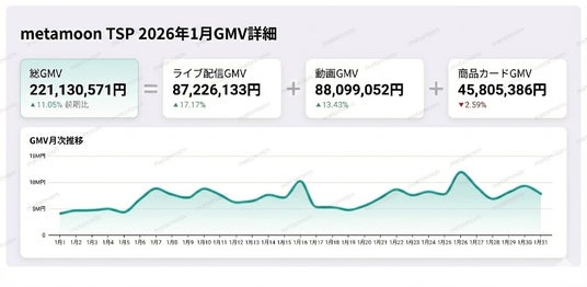 TikTok Shopの日本市場が本格成長フェーズに入る中、ブランド企業による「TikTok Shopアカウント運営」、「広告運用」、「ライブ配信実施」、「ショート動画制作」への需要が急速に拡大しています。TikTok公式認定パートナー(TSP)である「metamoon」は、2026年1月に月間GMV2.21億円を記録し、2025年11月より3ヶ月連続で月間GMV2億円を突破したことをお知らせいたします。また同社は25年Q3・Q4において、日本国内提携セラー数・ショート動画配信本数・契約店舗総GMVの3指標で第一位を獲得しています。