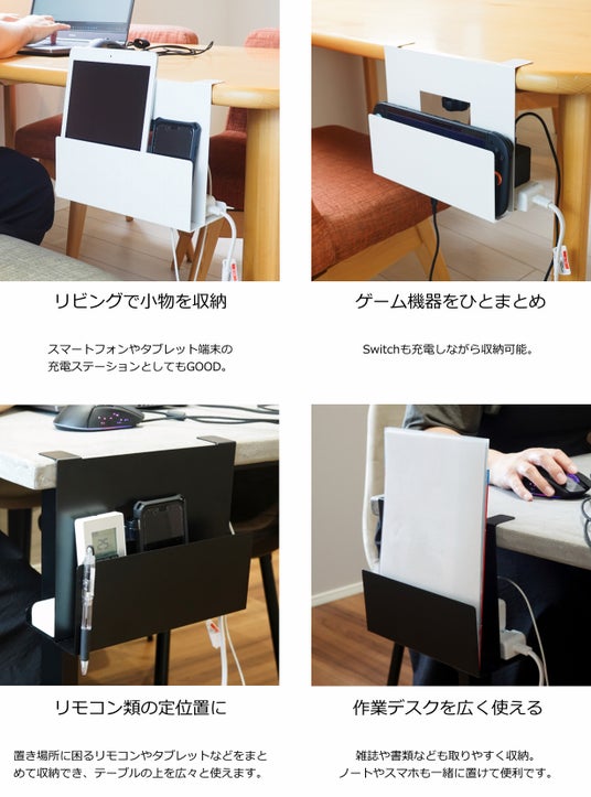 充電しながら収納できるラック「テーブルサイド充電ラック」を開発。ダイニングテーブルやデスクの天板に簡単に取り付けられ、調節ネジを使ってしっかりと固定でき、机のスペースを占有しがちな携帯電話、iPad、Switchなども充電しながらすっきりと収納できます。クラウドファンディングサービス「Makuake」にて10月22日11時より先行販売を開始し、わずか6時間で目標金額を達成いたしました!