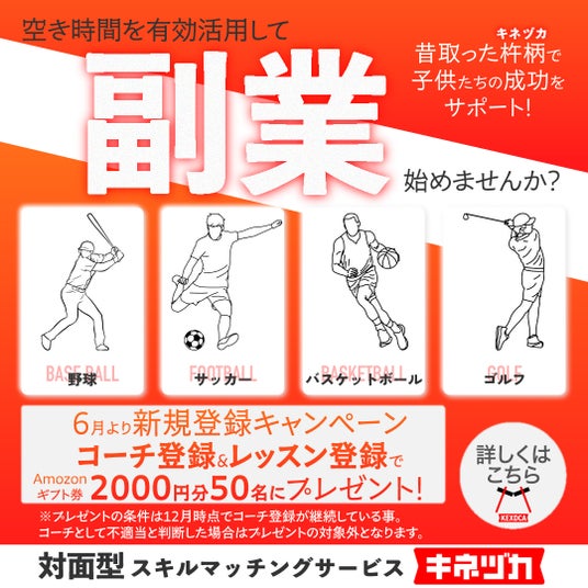 質の高いスポーツ指導を提供する株式会社杵臼(本社:東京都渋谷区道玄坂1丁目10番8号 代表取締役:前田高政)は、個々のニーズに応じたスキルマッチングサービス「キネヅカ」において、コーチ登録キャンペーンを実施することを発表いたします。本キャンペーンでは、コーチ登録及びレッスン登録を行った先着50名にAmazonギフト2,000円をプレゼントし、利用者のニーズにお応えする取り組みを進めてまいります。