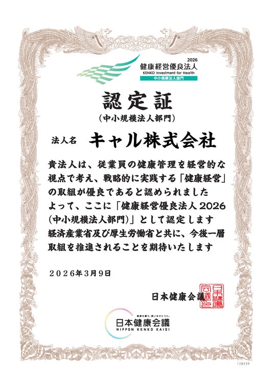 急成長を続けるキャル株式会社は、健康経営優良法人2026を取得しました。「誰もが挑戦できる社会」の実現に向け、従業員の健康意識向上や健康維持推進に取り組むことで、人的資本経営を推進しています。