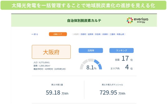 エブリワエナジーが展開する共同購入支援事業では、太陽光発電の発電量だけでなく電力会社のスマートメータから買電量、売電量をBルートで取得し、太陽光由来の自家消費量を1台で測定可能にする次世代型を採用しています。クラウド上の管理サイトで発電所を一元管理することで、導入された太陽光発電が「どれだけ脱炭素化に貢献しているのか」といった地域脱炭素化の“見える化”をめざします。発電状況を遠隔監視することで、万が一の不具合やメンテナンスにも対応していく予定です。