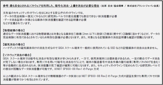 「1件でもデータ漏えいを起こさない」ためにも、全国自治体でGIGAスクール端末処分、データ消去に関する正しい認識を持ち、適正なデータ消去予算を確保し、安心・安全な端末処分の実現を切に願います。