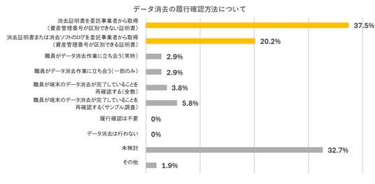 しかしながら、全国教育委員会の37.5%が「1台ごとの消去ログが取れないデータ消去履行確認の実施」と回答しています。さらに、「資産管理番号を区別可能(=データ消去作業ログが取れる)な証明書を委託事業者から取得予定」は20.2%と、大きな差が生まれています。